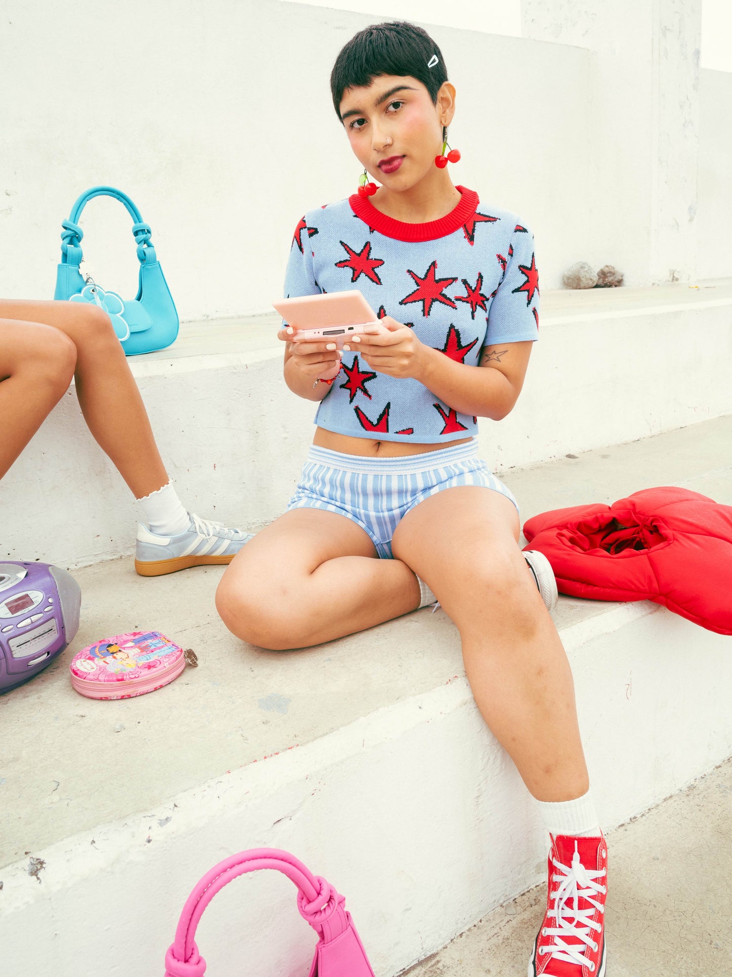El Pls I’m a Star Top es un crop top de algodón fresco y suave, diseñado para brillar (literalmente) en cada look. Su estampado de estrellas en jacquard combina tonos vibrantes como el azul y el rojo cereza, creando un contraste juguetón y lleno de personalidad.