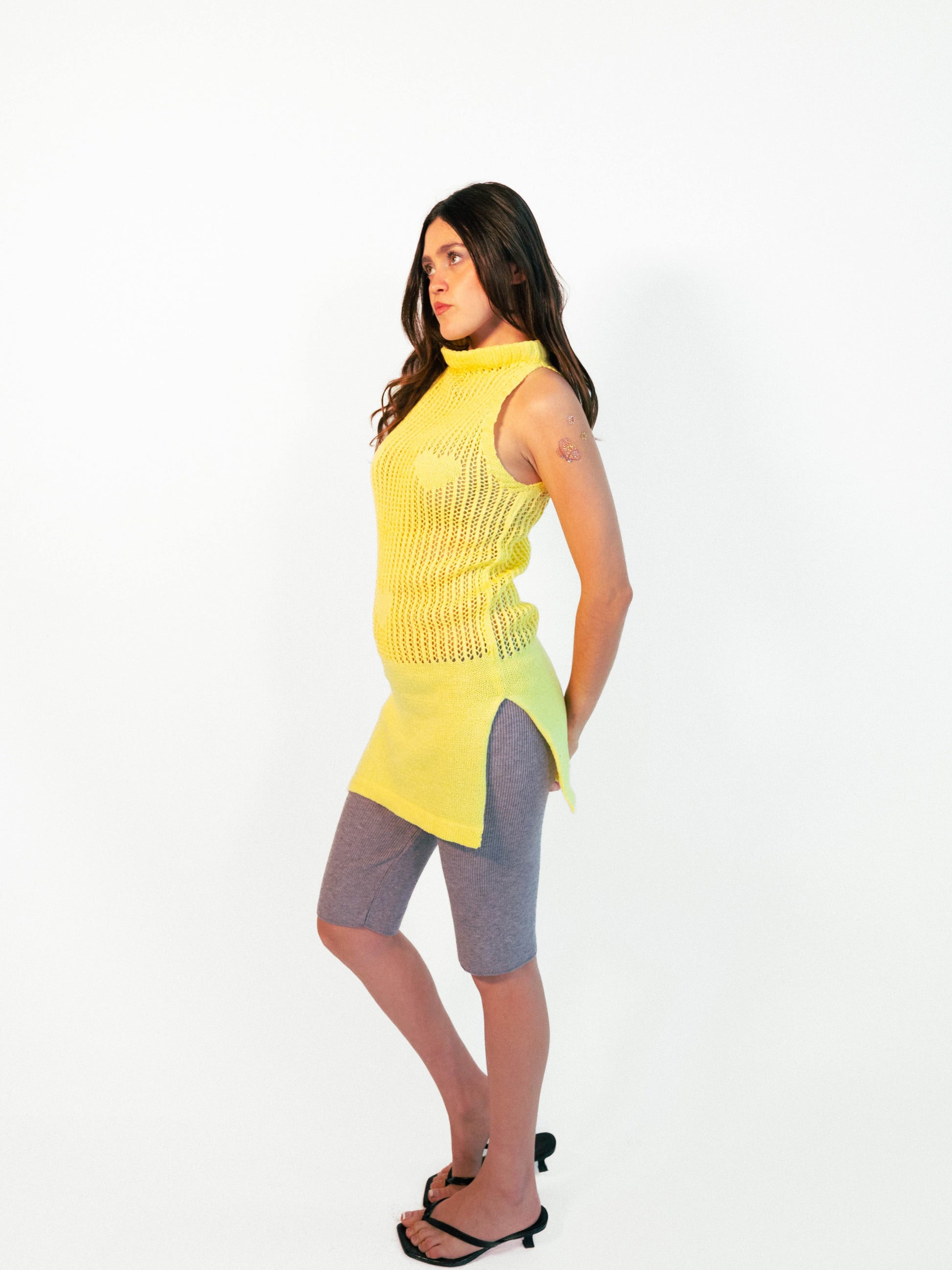 El So Hot Dress es un homenaje a las eras más icónicas del pop, reinterpretado a la manera Casa Leōn. Hecho en tejido de punto con calados que crean transparencias en todo el torso, este vestido juega entre lo atrevido y lo delicado. Los motivos de corazón están estratégicamente colocados para cubrir lo necesario, dejando que la piel se asome justo donde debe.